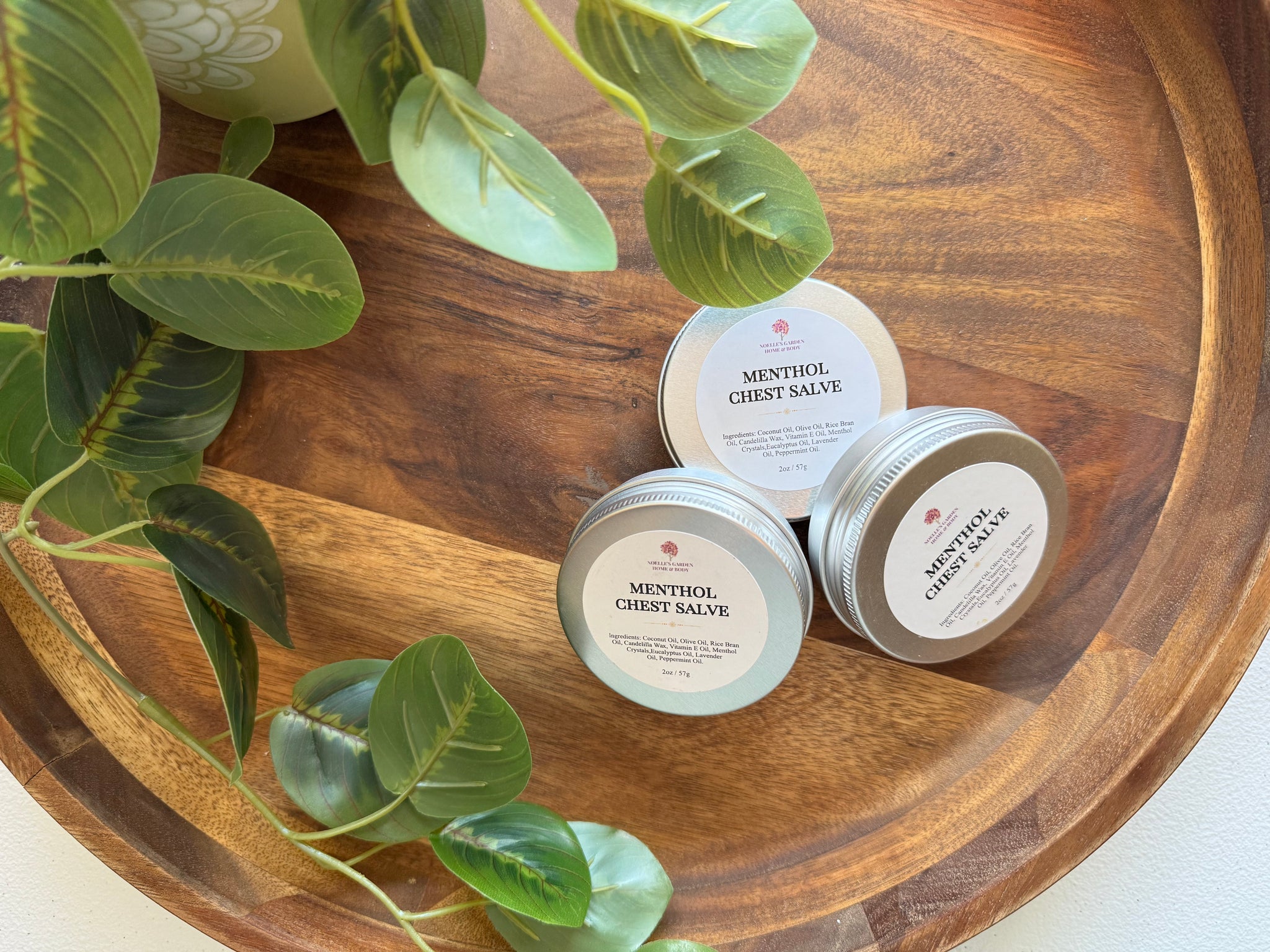 Menthol Salve Ingredients: Coconut Oil, Olive Oil, Rice Bran Oil, Candelilla Wax, Vitamin E Oil, Menthol Crystals, Eucalyptus Oil, Lavender Oil, Peppermint Oil.